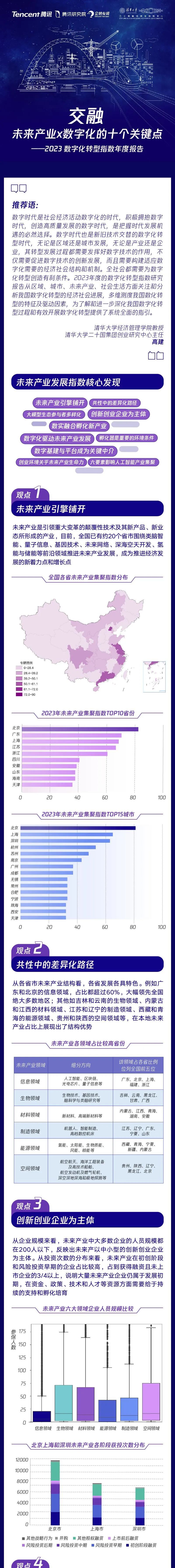 未来产业是指引领重大变革的颠覆性技术及其新产品、新业态所形成的产业。2023年7月7日全球数字经济大会闭幕式上,腾讯研究院联合腾讯企鹅有调、清华大学二十国集团创业研究中心发布的《数字化转型指数报告 2023》,在历年关注全国数字化转型进程的基础上,首次开展了对全国未来产业发展趋势的量化研究,基于 5.5 万家未来产业领域的企业创投数据,初步勾勒出了全国未来产业地图。