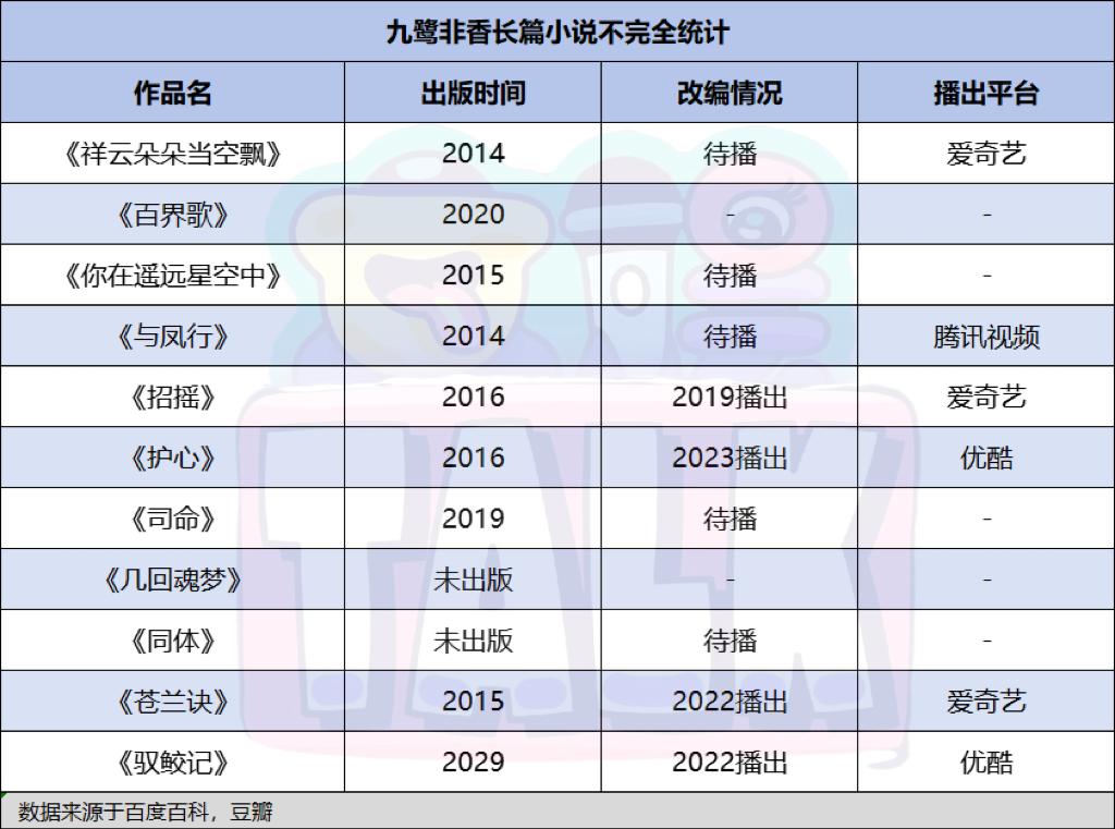 kk统计了九鹭非香的长篇小说作品,从2011年开始写作至今,九鹭非香几乎所有的作品都已经成功出版,而其中较为脍炙人口也都完成了影视化改编。从成绩来看,九鹭非香毫无疑问属于那种作品成熟,运气也很好的网文作者。