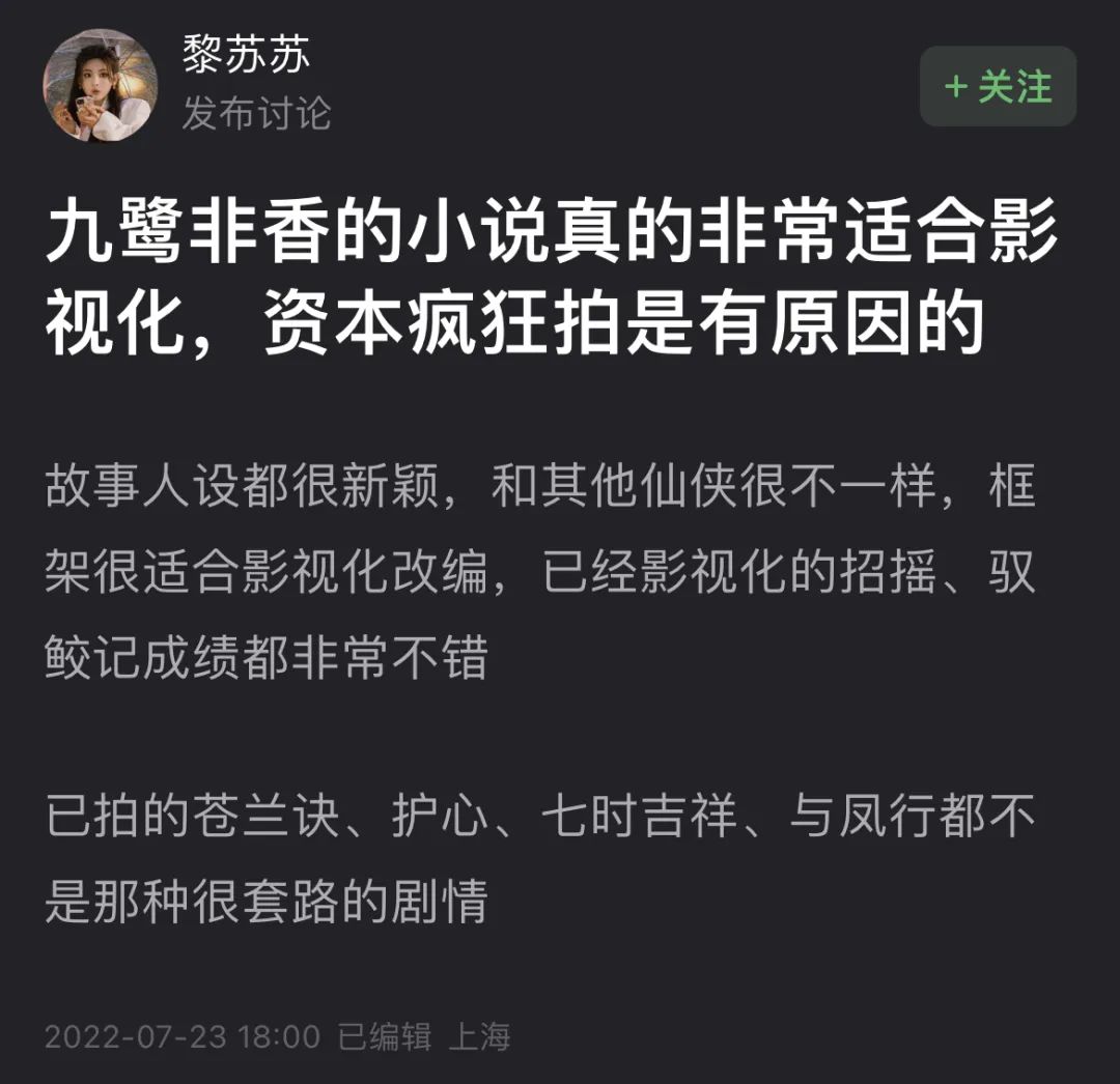 但又与那种被大部分网友熟知,有那么一两部能称得上大IP的作者又有所不同,即使是在仙侠这个小类别里,九鹭非香只能算得上是出名,算不上“破圈”。是的,在当下这个注意力极致分散的年代,网文也有着自己的小圈子。