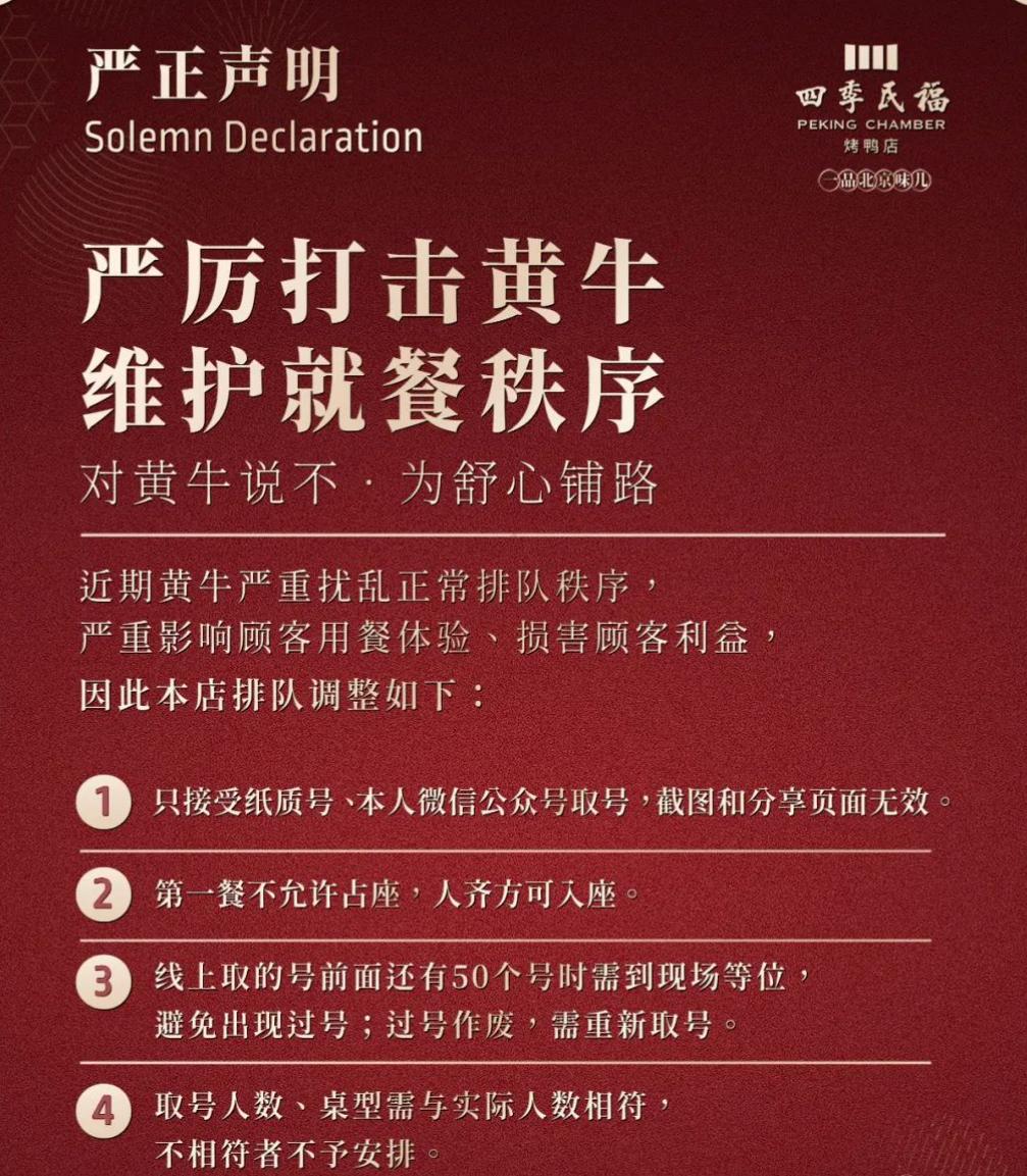 但凡来到北京,大多数人第一时间想到的都是品尝北京烤鸭。各大烤鸭店前大排长龙,四季民福甚至还发布声明要严厉打击黄牛。
