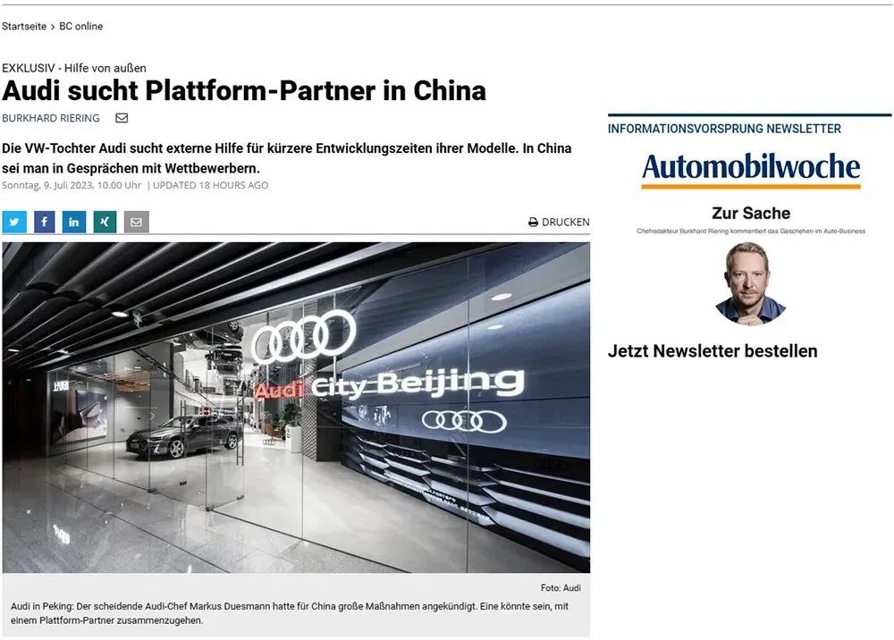 就在近日,德国媒体报道了奥迪计划从中国竞争对手购买现成纯电平台的消息。