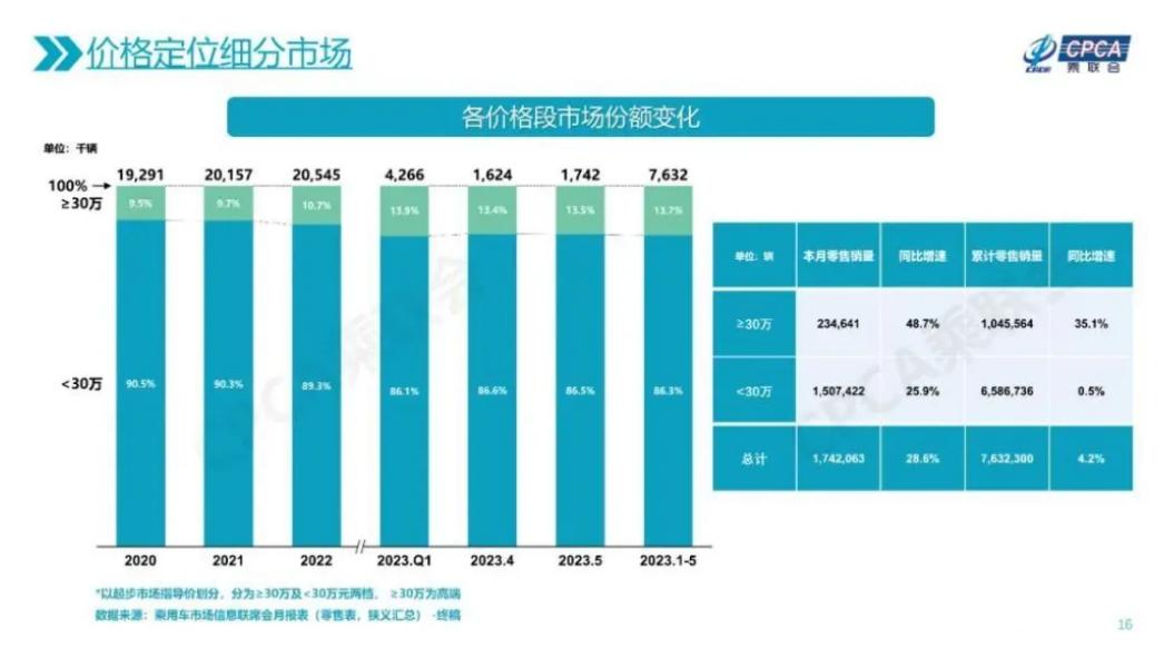 另一个数据来看,豪华车在国内卖得越来越好。乘联会发布的市场分析报告显示,今年前5个月,30万元以上车型累计零售销量同比增长了35.1%,达到104.6万辆。作为对比,30万元以下车型同比增速只有0.5%。
