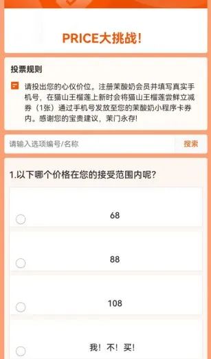 7月,茉酸奶就新品“猫山王榴莲”发布价格接受范围的调查问卷,选项中起步价68元,最高达108元。网友将其比作“宫廷玉液酒”,并锐评“我不如直接去买榴莲”。