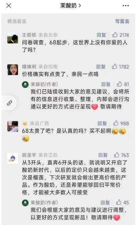 ↑↑↑近日,茉酸奶上线了一份问卷调查,征集消费者对即将上新的猫山王榴莲奶昔的心理价位,三个价格选项分别为68元、88元、108元,网友们的留言基本都是“喝不起”。