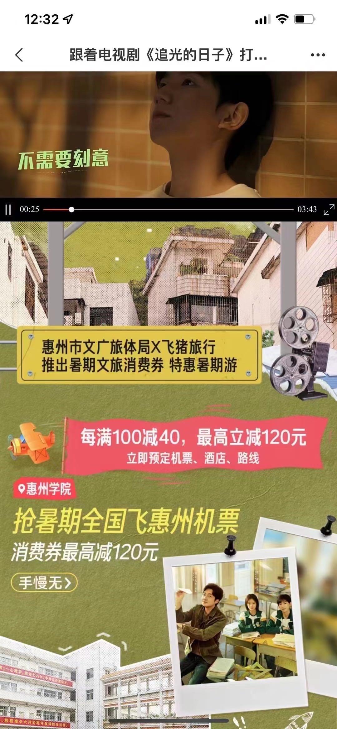 娱乐独角兽观察到,最近,这一新的文旅融合方式已经落地。在央视一套热播剧集《追光的日子》就直接联合广东省惠州市文广旅体局和飞猪旅行,发放旅游消费券,从机票、酒店方面推出特惠暑期游。