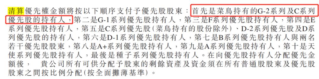 不仅如此,菜鸟在速腾聚创享受的权益颇高。招股书提及,若企业进行清算,清算优先权第一的是菜鸟持有的G-2系列及C系列优先股的持有人。