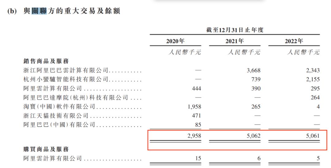 招股书显示,2020-2022年,速腾聚创向阿里系销售商品及服务的交易额分别为295.8万元、506.2万元、506.1万元;购买阿里云服务花费1.5万元、6000元、5000元。