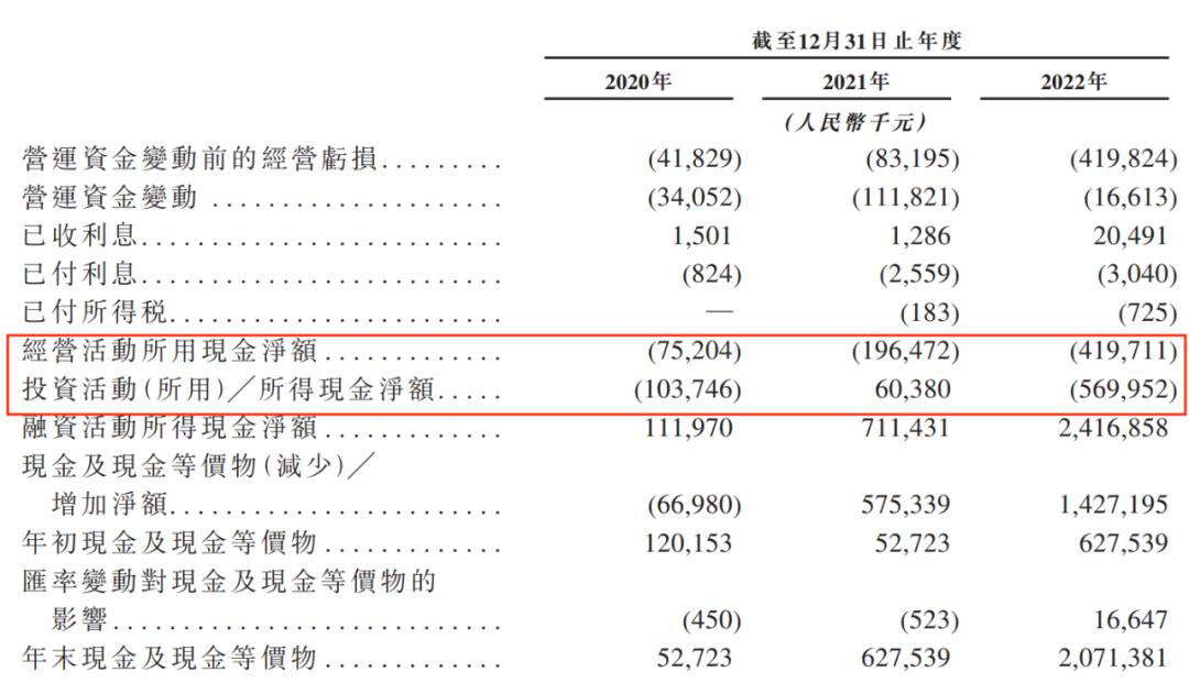 招股书显示,2020-2022年,企业经营现金流净额分别为-7520.4万元、-1.96亿元、-4.20亿元;投资现金流净额-1.04亿元、6038万元、-5.70亿元。