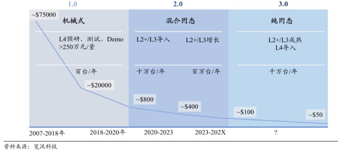 根据Livox预测,2020年混合固态激光雷达价格800美元/颗,2023年混合固态激光雷达价格400美元/颗。此外,开源证券预测2027年固态激光雷达价格将降至100美元/颗。