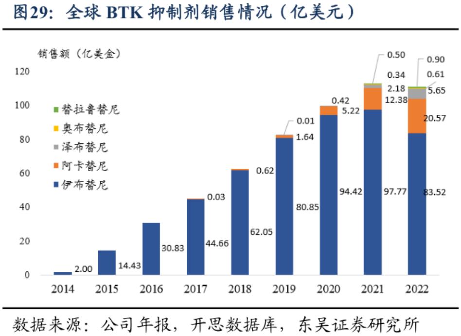 截至目前,全球已经有6款BTK抑制剂上市,7款产品正处于临床III期阶段。除了具有先发优势的伊布替尼之外,阿斯利康的阿卡替尼2022年度全球销售额达到20.57亿美元,同比增长66%,同时也是泽布替尼的一大对手。