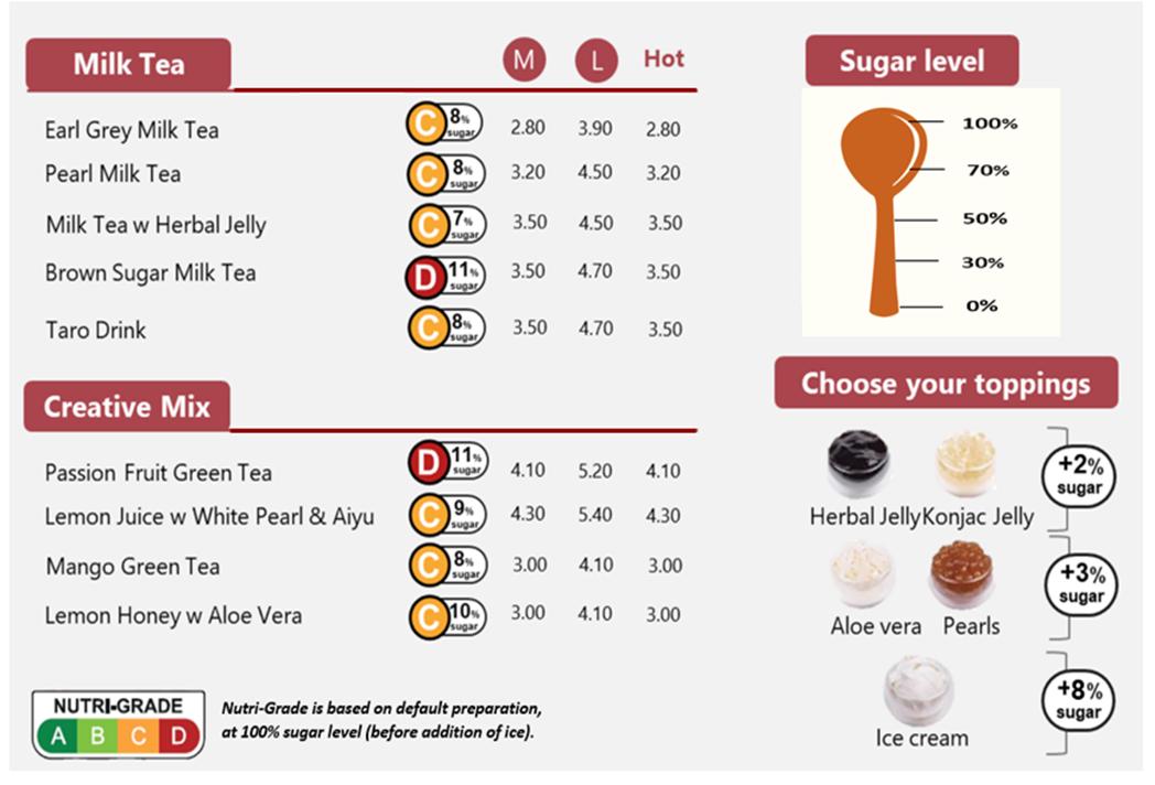 对于现制饮品,HPB开发出简化版的Nutri-Grade标记,从A级到D级的含糖量,分别为0%、4%、8%、12%。