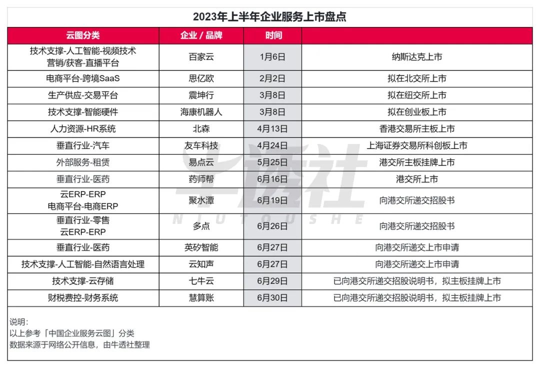 2023 年上半年发生上市相关事件 14 起,涉及 14 家企业,实际完成上市的为 5 家企业,成功上市率 35.7%。已上市的企业中,1 家为美股,3 家为港股,仅友车科技 1 家是在科创板上市。从上面的图表中可以看出,垂直行业和技术支撑是上市企业的两大门类。