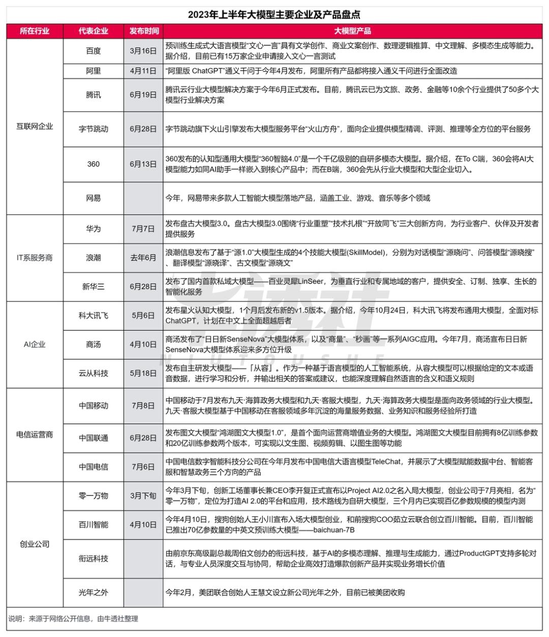 去年底以来,ChatGPT 与大模型的全球爆红,为科技界注入了一剂强心针,包括以“BAT”为代表的互联网公司,以华为为代表的 IT 系服务商,商汤、科大讯飞等人工智能企业,中国移动、中国联通、中国电信为代表的电信运营商,还有教育/金融/医疗等行业企业纷纷入局。