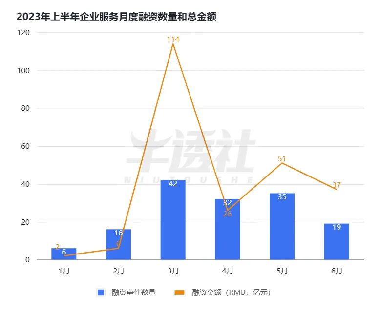 2023 年上半年企业服务月度融资数量和总金额