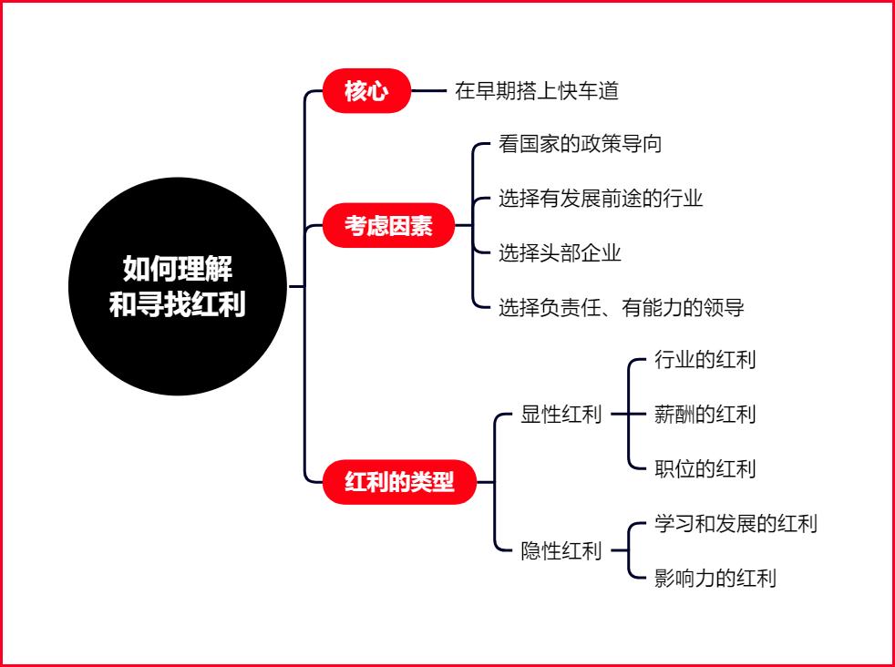 Julia:每个人对红利的理解都有每个人的观点和看法。永禛理解的红利是在早期阶段进入到一个高发展的公司或者赛道,而后获得高回报。我觉得这是个人拥有一定的幸运成分,因为大部分人不具备那么牛的眼光和长期主义的意识,所以我们享受的红利更多还是在比较宽泛的场景下,是不是能够进入一个相对让我成长更快,获得更快发展的行业或公司,包括以下几个方面。