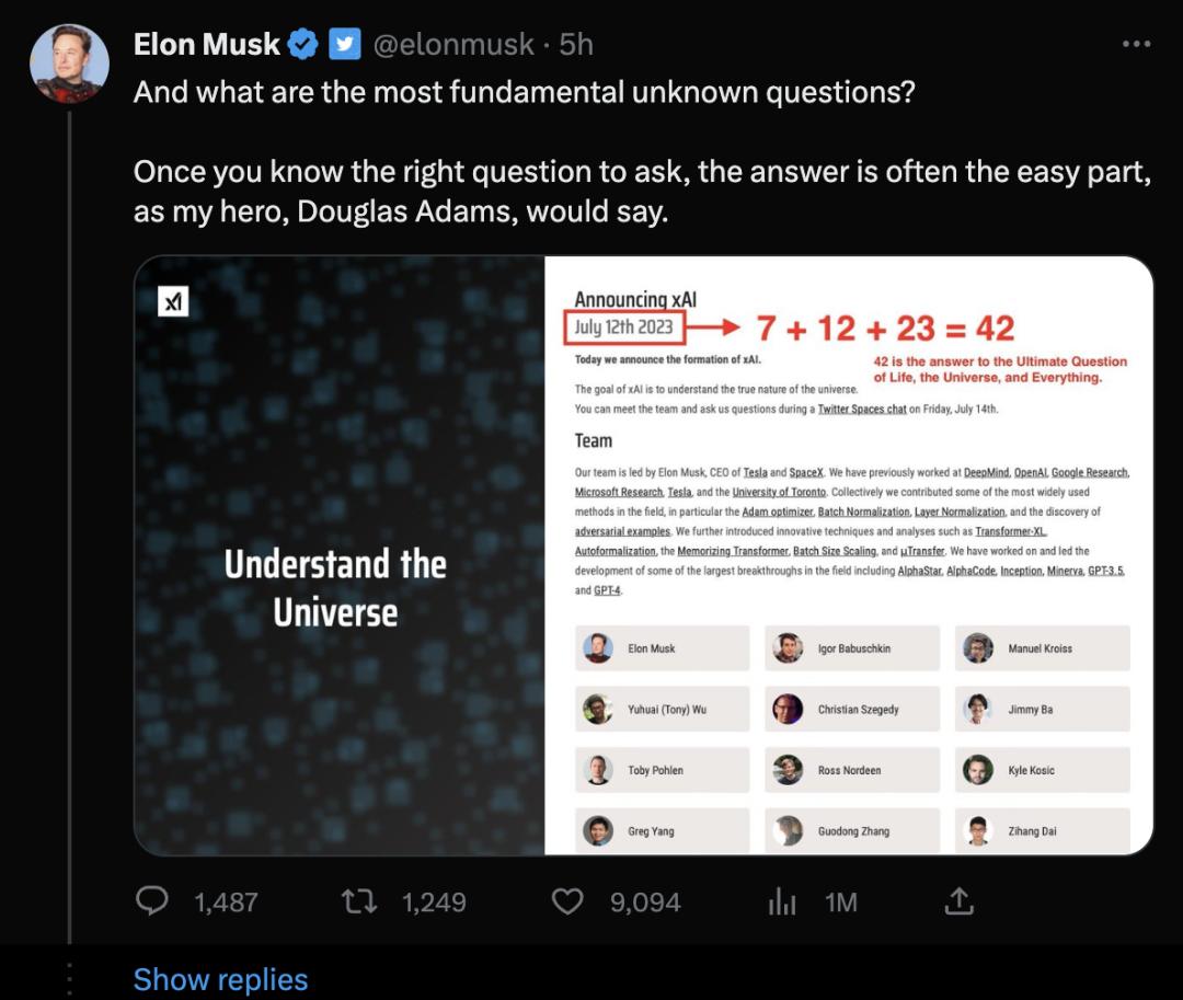 马斯克透露,他在选择在2023 年 7 月 12 日公布 xAI,是因为他想借此纪念道格拉斯·亚当斯 (Douglas Adams) 的《银河系漫游指南》。