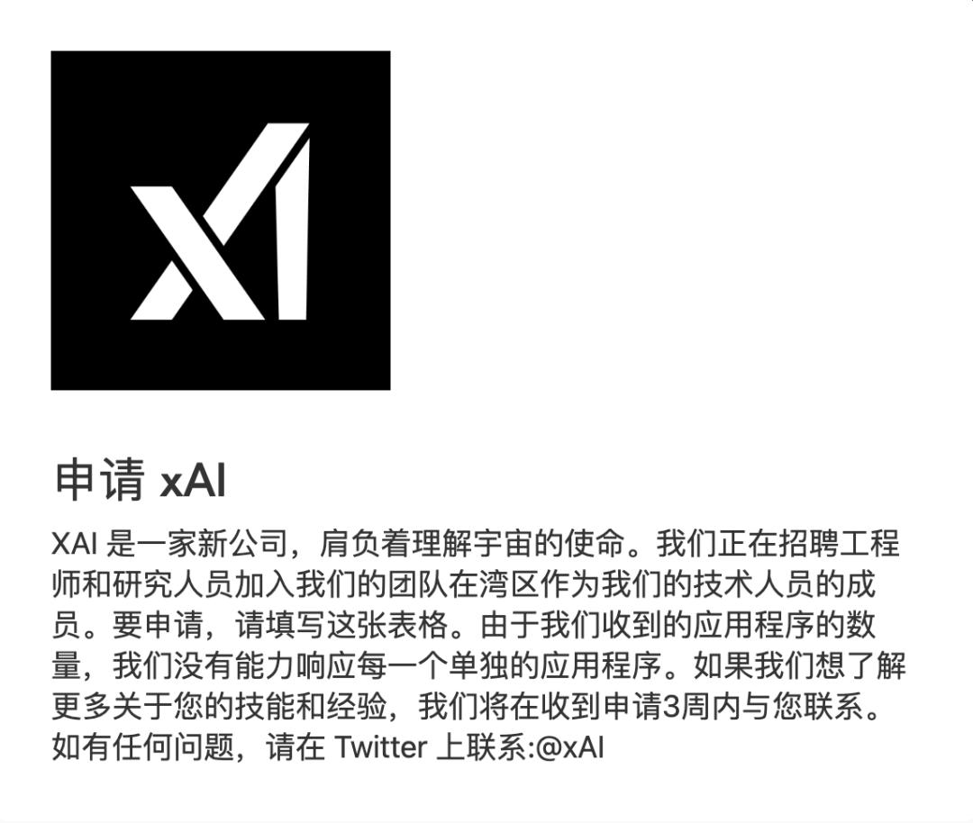 当然,仅靠这 11 个核心成员就想与员工数已经突破 600 人的 OpenAI 竞争,还是太难了。xAI 也同步开启了招人计划,招揽 AI 相关的技术人才加入。