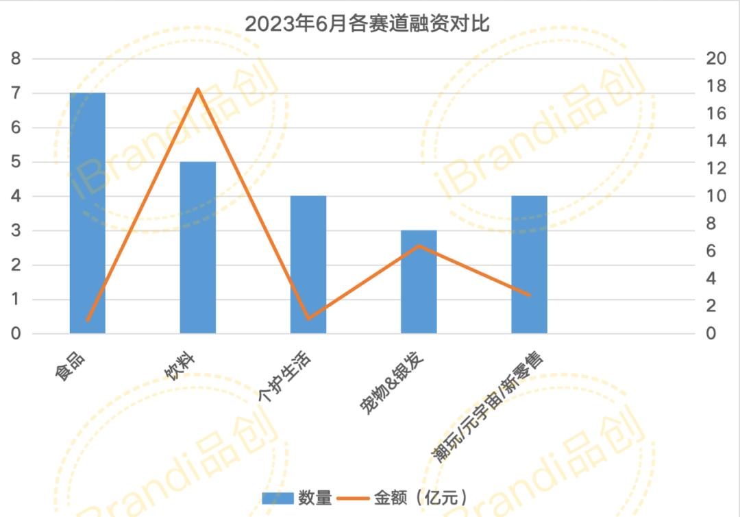 具体来看,在6月的23起投融资项目中,食品以7起拿下数量TOP,其次为包含新茶饮、咖啡的饮品市场,共披露5起融资。此外,个护生活与潮玩/元宇宙分别拿下4起,银发经济2起,宠物赛道1起。