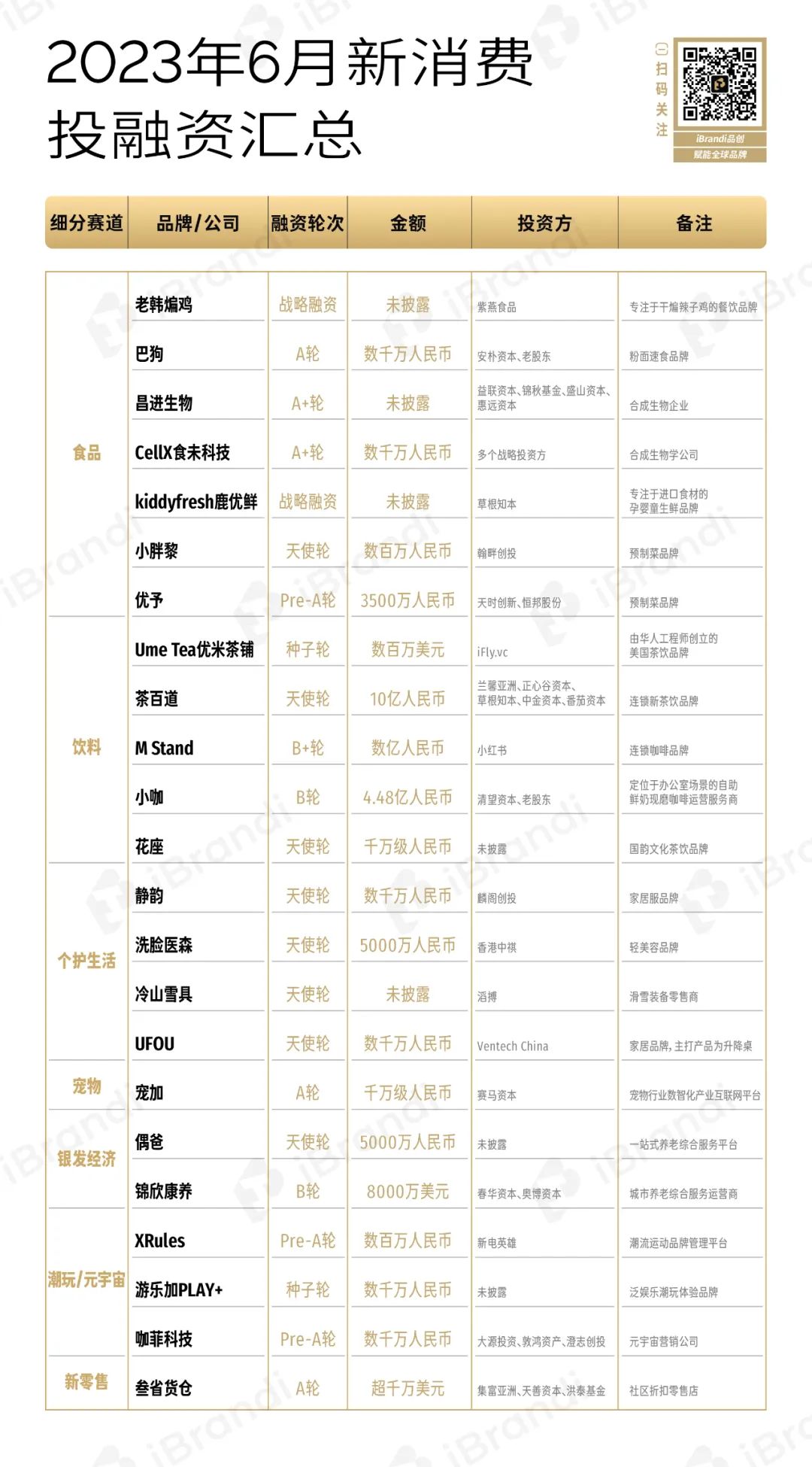 1、该融资数据由「iBrandi品创」不完全统计,由于新消费涉及面较广,故可能存在统计遗漏情况;