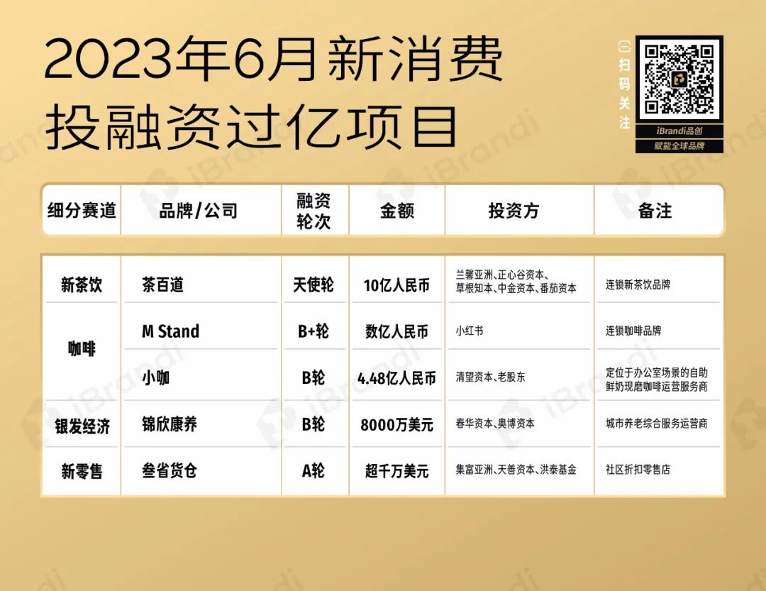 最后5起便是亿级融资。其中,新茶饮连锁品牌「茶百道」完成10亿元人民币天使轮融资,两家咖啡品牌「M Stand」、「小咖」也分别拿下超亿元融资。最后两起分别发生在银发经济与新零售赛道。
