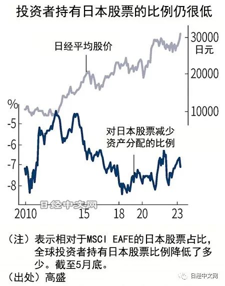很多投资者持有日本股票的比例低于日本股在全球股指中的占比。据高盛集团介绍,美国MSCI计算的以北美以外发达国家指数为标准的全球投资者持有日本股票的比例截至5月底比指数低7%以上。由于日本股价上涨,“减配”幅度比上月扩大。