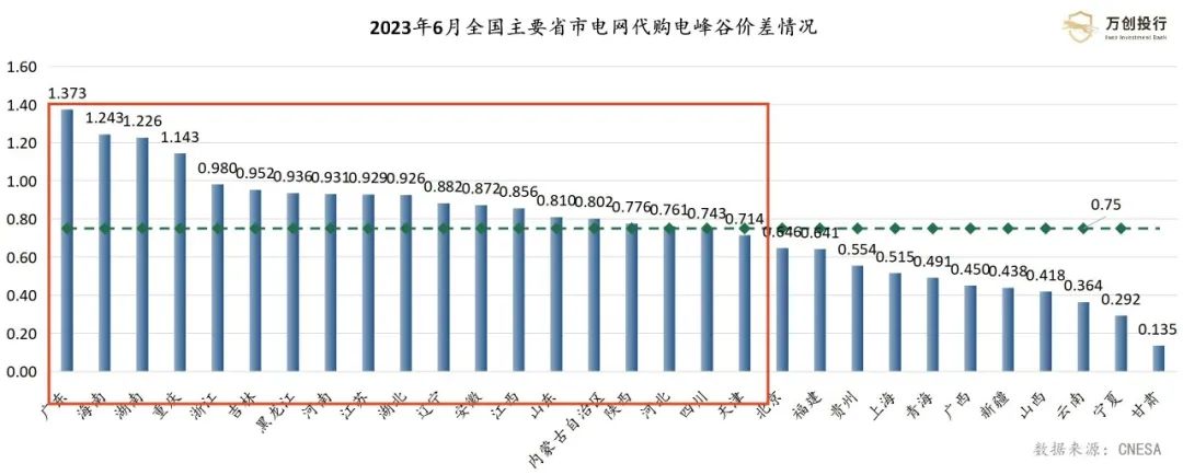 截至2023年6月,全国峰谷价差超过0.7元/kWh的省市的数量有所增长,从2022年7月的6个升至2023年6月的19个。各地峰谷价差也有持续拉大的趋势,全国平均峰谷价差也由2022年10月的0.62元/kWh增长至2023年6月的0.75元/kWh。
