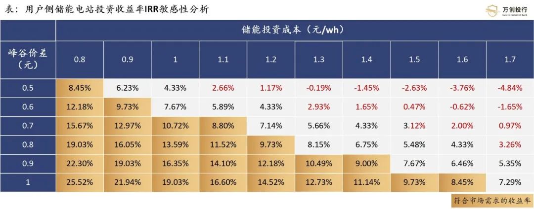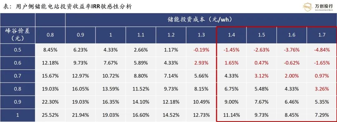 当前用户侧储能投资收益率较低。因为工商业储能电站主要为锂电储能。工商业储能装机主要受经济性驱动,目前用工商业储能电站投资成本约1.4~1.7元/wh,当峰谷价差低于0.7元时,电站的投资收益率或低于5年期及以上LPR。