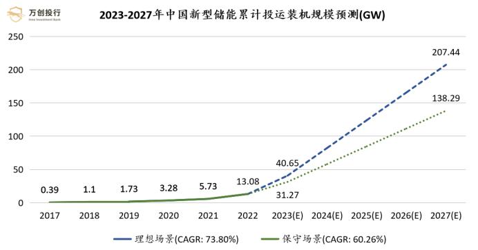 新增装机规模预测:预计未来5年,在电源侧、电网侧和用户侧储能同步快速发展的背景下,年度新增储能装机呈快速上升趋势。保守场景下,2027年预计新型储能累计装机规模为138.29GW;理想场景下,2027年预计新型储能累计装机规模为207.44GW,市场空间广阔。