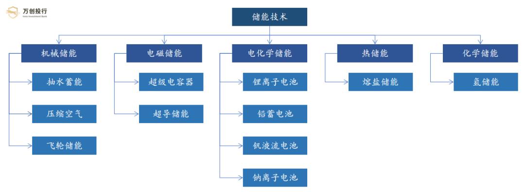 当前储能呈多技术路线并存状态。从技术上划分,储能可分为机械储能、电磁储能、电化学类储能、热储能与化学储能五大技术路线。
