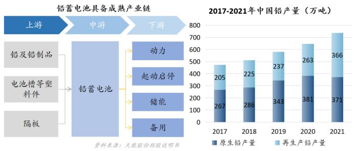 中国铅资源较为丰富,且回收已全面实现产业化,对废旧铅蓄电池中铅金属的回收率已可以超过99%,再生铅的产量及应用持续增加。再生铅的广泛利用减少了铅矿开采对环境可能造成的影响,提升了铅蓄电池的可循环再生利用性。