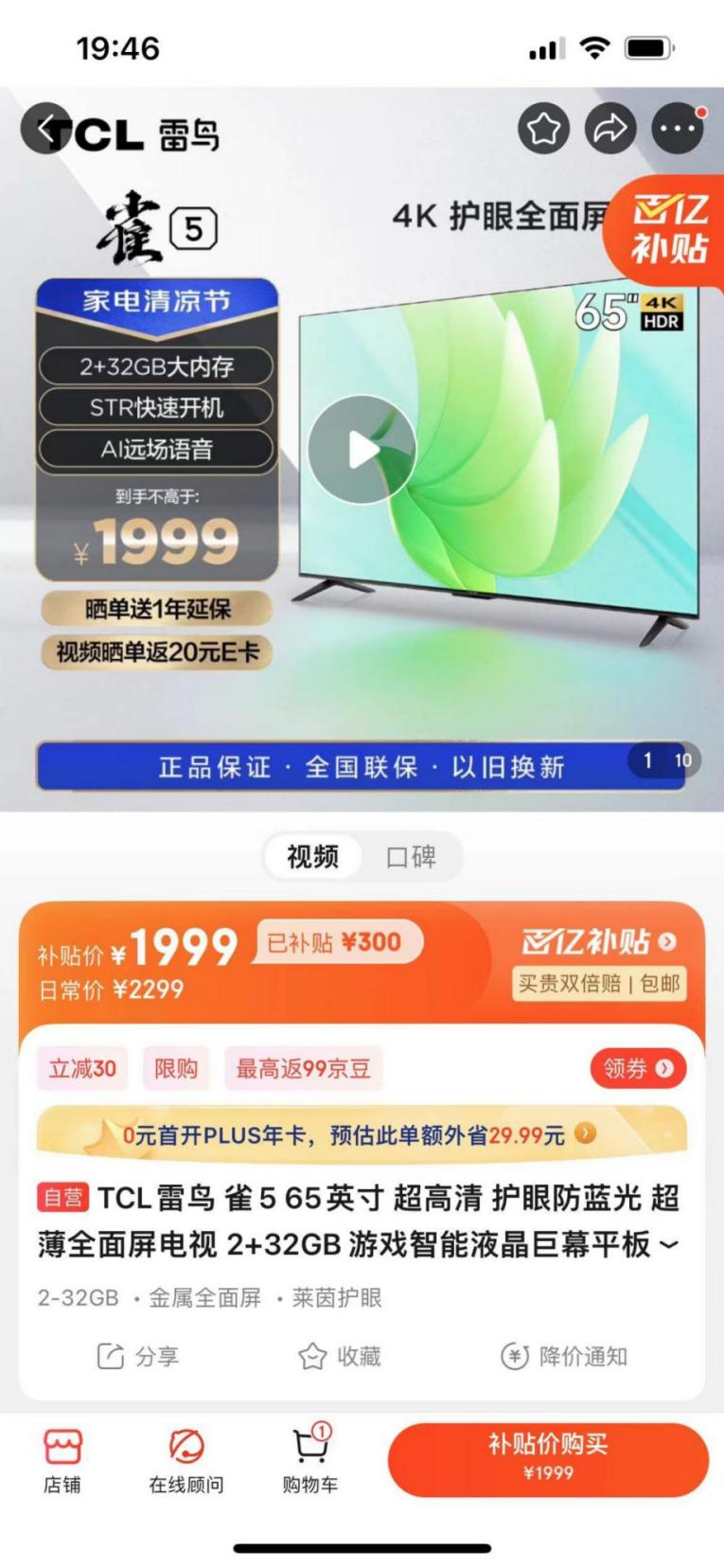 首席商业评论观察到,去年12月,TCL京东自营官方旗舰店内65英寸电视有售价1599元的产品,如今最低价涨至1999元,涨幅同为400元。