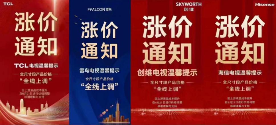 自7月1日起,TCL 对智屏(TV)产品价格做调整,预计整体上调 15%-20%,同时,TCL电视还提醒,未来将会视成本变化情况调整产品价格;康佳电视称自6月21日全尺寸段产品价格全线上调,调价幅度普遍超过15%;海信、创维也发布涨价通知,显示全尺寸段产品价格全线上调。