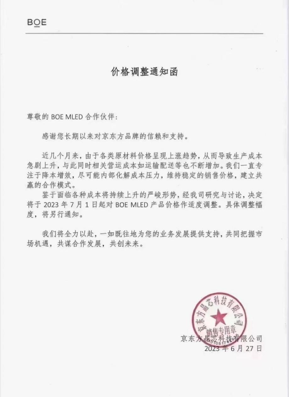 以头部面板厂商京东方晶芯为例,继5月宣布涨价后,京东方晶芯月再次对MLED产品做适度调整,具体调整幅度,将另行通知。