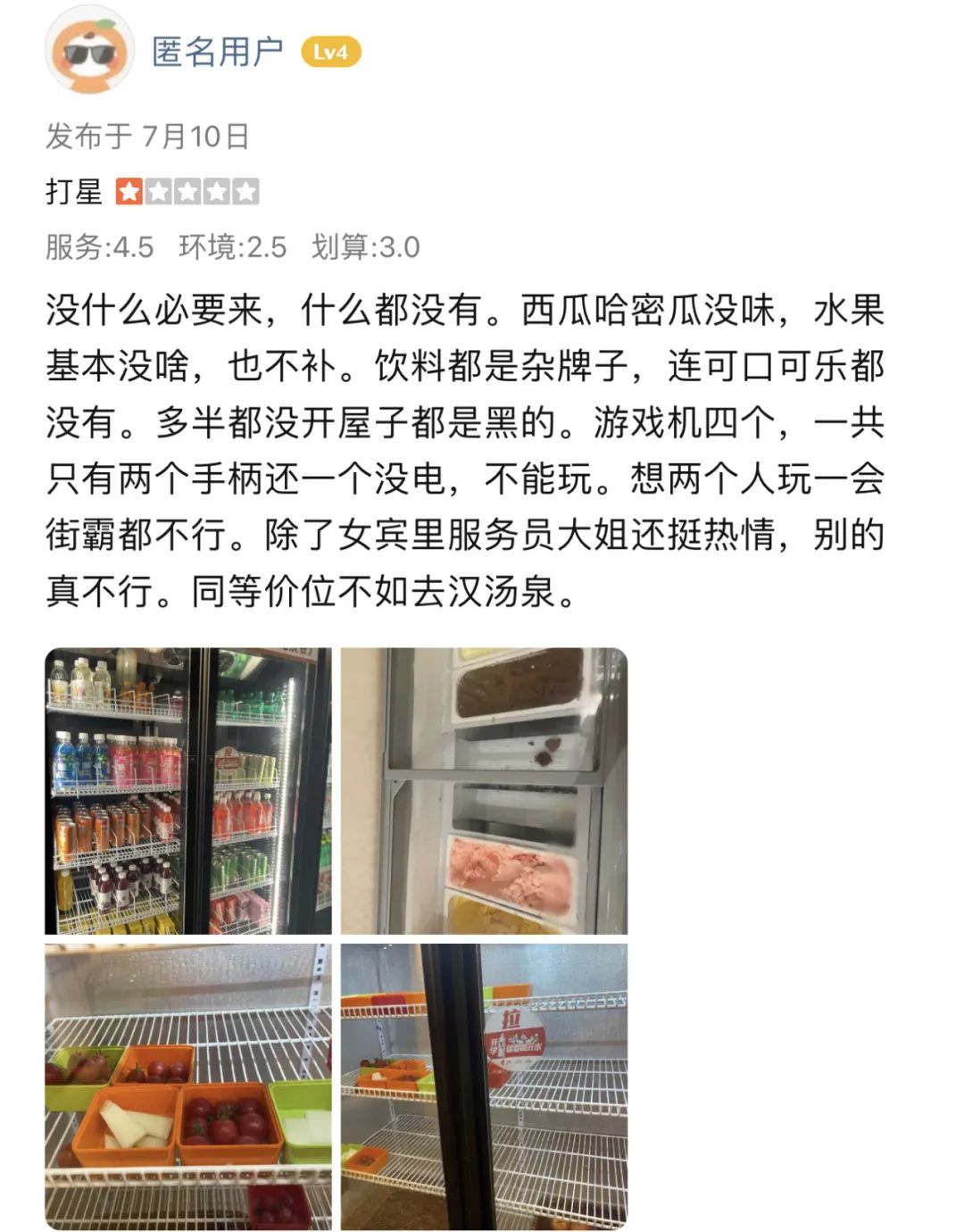 白菜价的门票,对应的服务远不如高端汤泉。小海注意到,直播间里说的“各种水果”,到了店里变成三种——西瓜、哈密瓜、圣女果;冰柜里的饮料不少是临期产品,正版雪碧中间夹着几瓶山寨产品;冰淇淋里还能吃到冰碴。