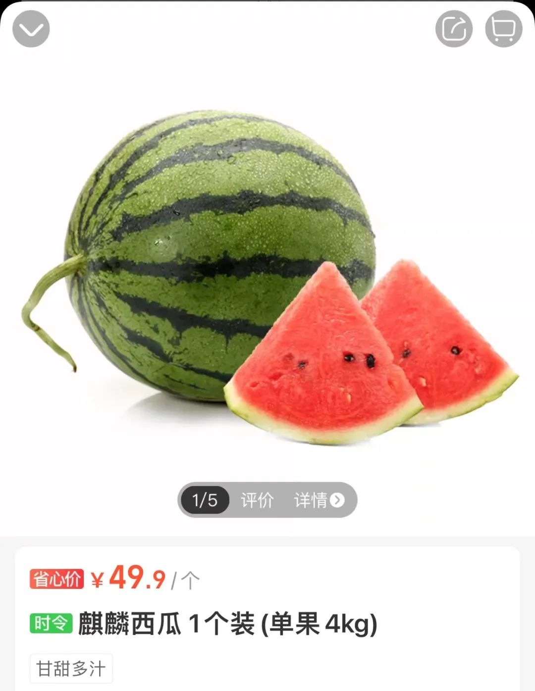 在盒马App上定位到北京,一颗4千克的麒麟西瓜标价49.9元,每斤价格6.23元。这个价格还只是入门价,但凡想吃个其他品种都得加钱。