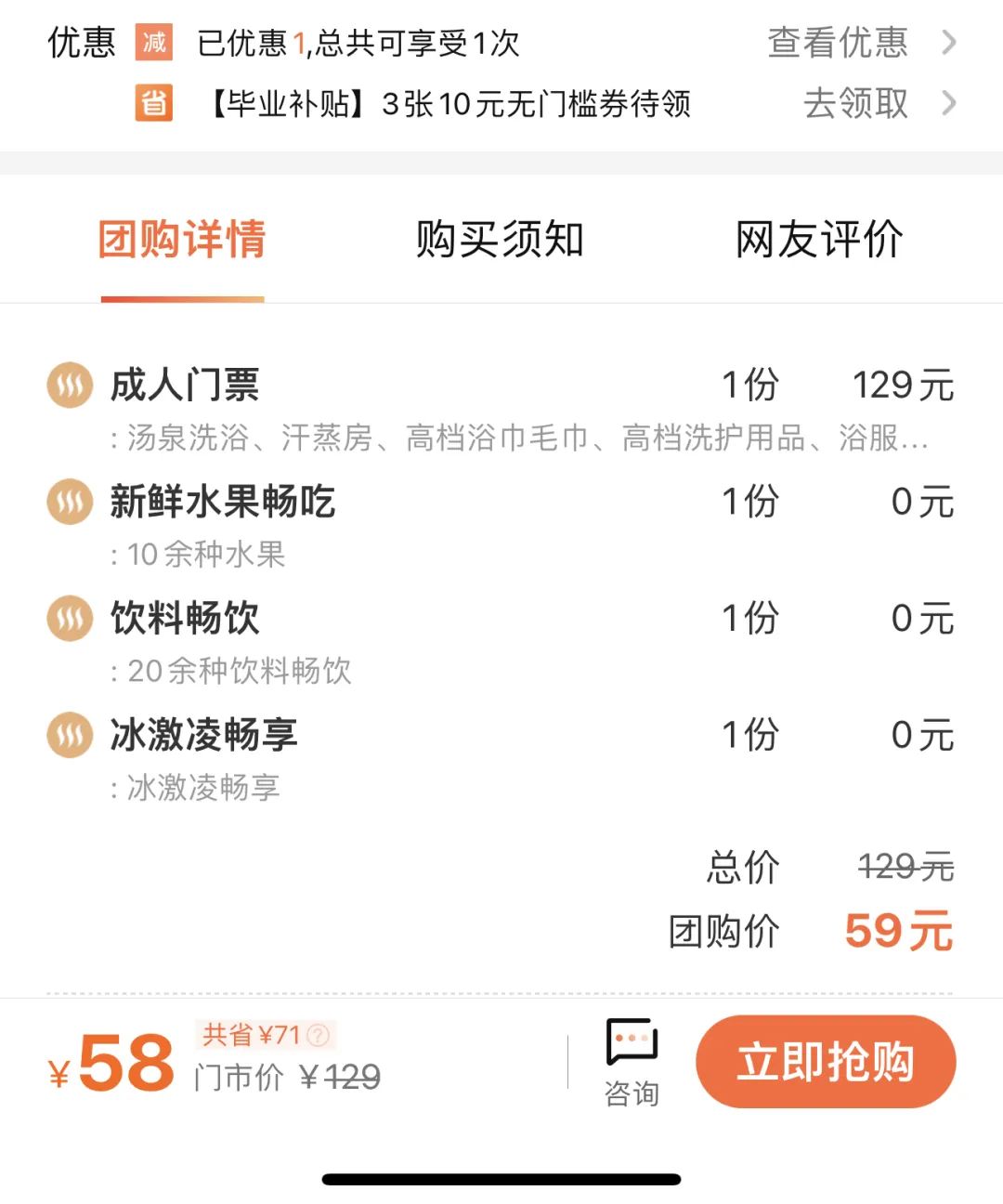 第一条要点是只买门票。“带自助餐的套票,自助餐华而不实;带搓澡的套餐不要买,加个廉价红酒和浴盐就贵了一百块,团购门票后在店内直接搓个普通的澡比买套餐划算。