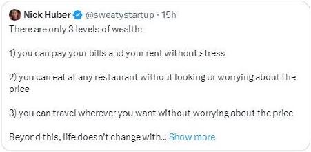 Sweaty Startup创始人尼克·胡伯(Nick Huber)近日发推称:“财富只有3个等级:一是你可以毫无压力地支付账单和房租;二是你可以在任何一家餐馆吃饭,不用看也不用担心价格;三是你可以去任何你想去的地方而不用担心价格。除此之外,生活并不会因为更多的钱而改变。”