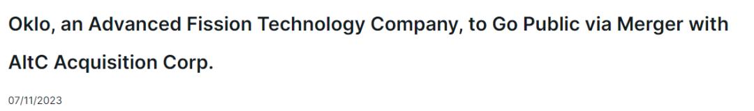 当地时间周二(7月11日),核裂变初创公司Oklo Inc.在官网宣布,其已与特殊目的收购公司(SPAC)AltC Acquisition Corp.达成最终的业务合并协议。