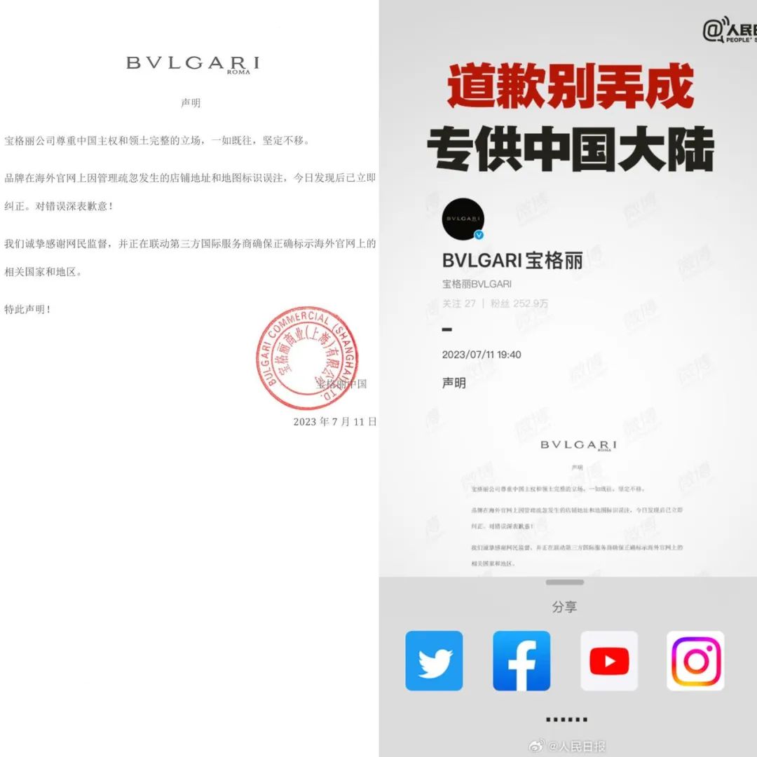 随后,宝格丽中国在其官方微博表示,“品牌在海外官网上因管理疏忽发生店铺地址和地图标识误注,发现后已立即纠正,正在联动第三方国际服务商确保正确标示海外官网上的相关国家和地区”,并对其致歉。