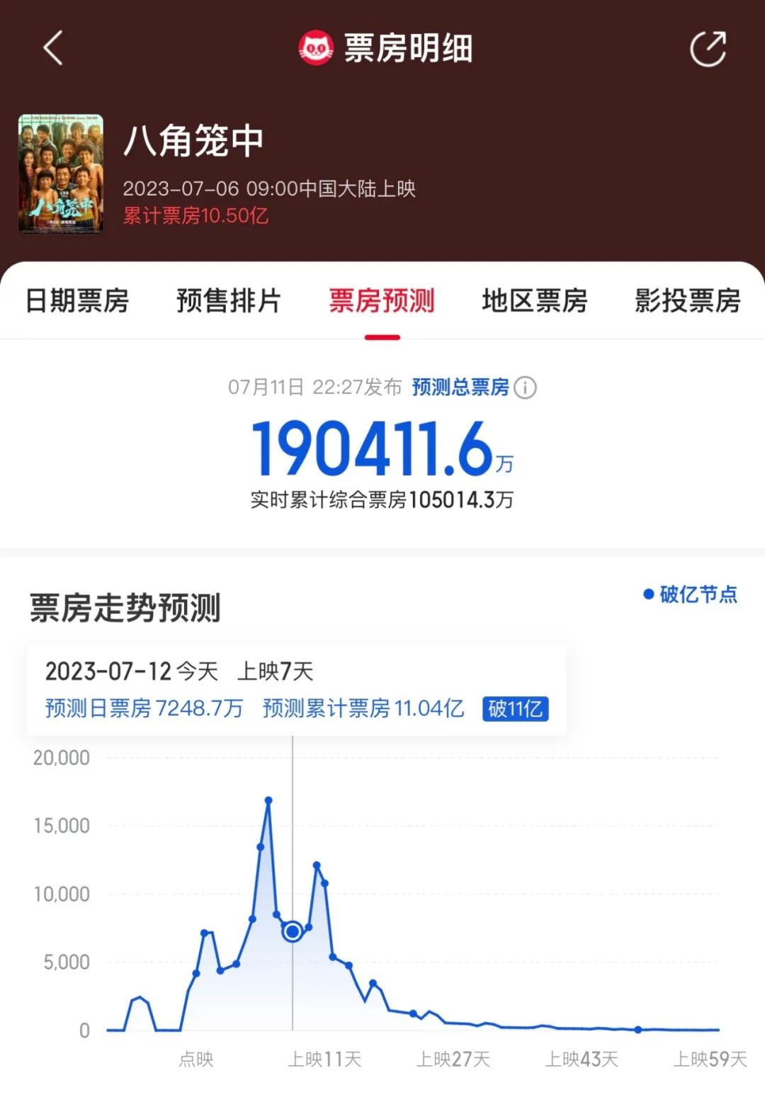 当然,刚刚过去的7月上旬,很大程度上还是要靠《消失的她》的带领。进入7月的首周,影片依然牢牢占据着日冠的票房宝座,直到《八角笼中》上映的第三天,后者才正式超过《消失的她》荣登日冠的位置。而就在《八角笼中》正式上映之前,影片的点映票房就已经超过4亿了。