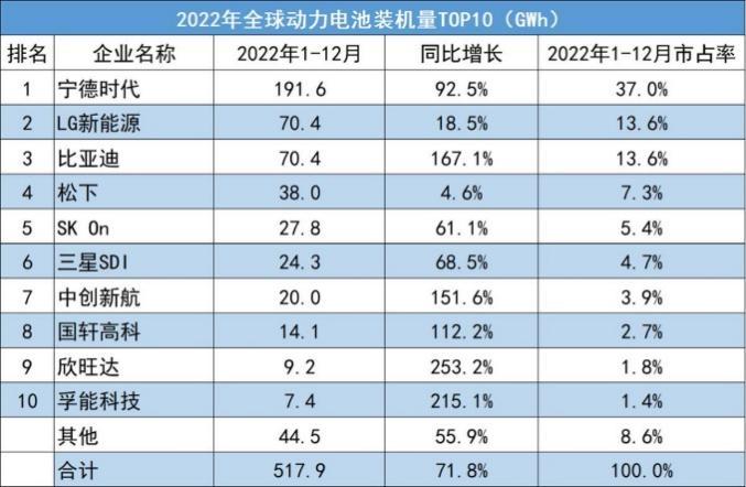 据SNE Research发布的数据,2022年全年,全球动力电池装车量达到517.9GWh,同比增长71.8%。在装车量前十名的企业中,中国动力电池厂商占据6个席位,合计市场份额达60.4%。该数据看似很大,但是仔细分析会发现,大部分都来自于我国市场的贡献。