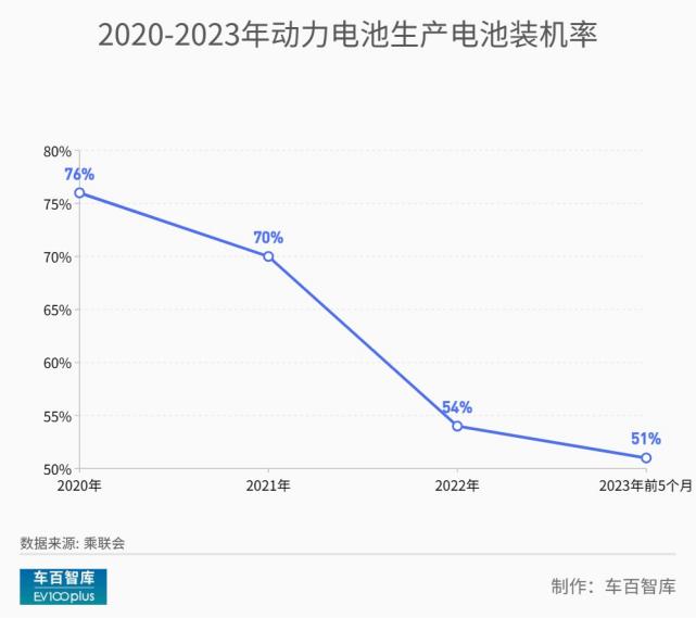 近三年来,动力电池产量中装车的比例在不断的降低,据乘联会,该比例从2020年的76%,2021年电动70%,2022年的54%,一直降到2023年5月的51%。