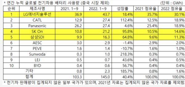 除中国市场以外的全球电动汽车电池装车量排名 图源:SNE Research