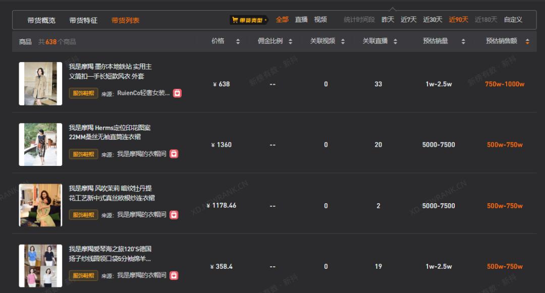 一年半过后,据新榜旗下抖音数据工具新抖 统计,“我是摩羯”近90天的累计预估GMV在2.5亿-5亿元之间,单场最高预估带货1000万-2500万元。