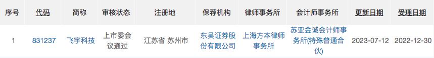 北交所官网显示,飞宇科技上市材料于去年12月30日获受理,今年6月回复完二轮问询,7月12日过会。