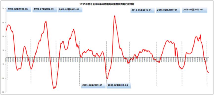 如上图所示,从1995年至今,中国总共走过了8轮基钦周期,每一次周期,跟全球半导体行业同比增速的走势,基本上是吻合的,大部分的起点和终点是对得上的。往往每一次中国基钦周期的起点和终点,对应的都是全球半导体销售额同比增速的低点。