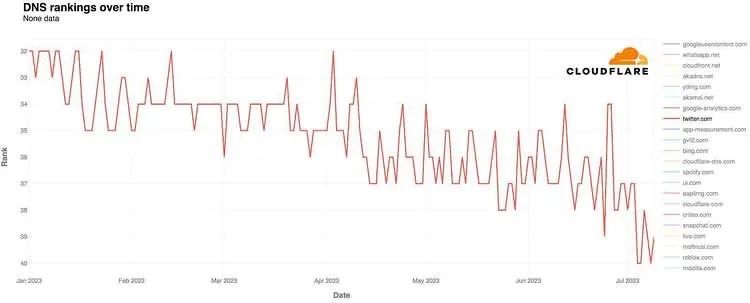 Cloudflare首席执行官Matthew Prince近日还分享了一张关于推特受欢迎程度的图表,并评价“推特的流量暴跌”。