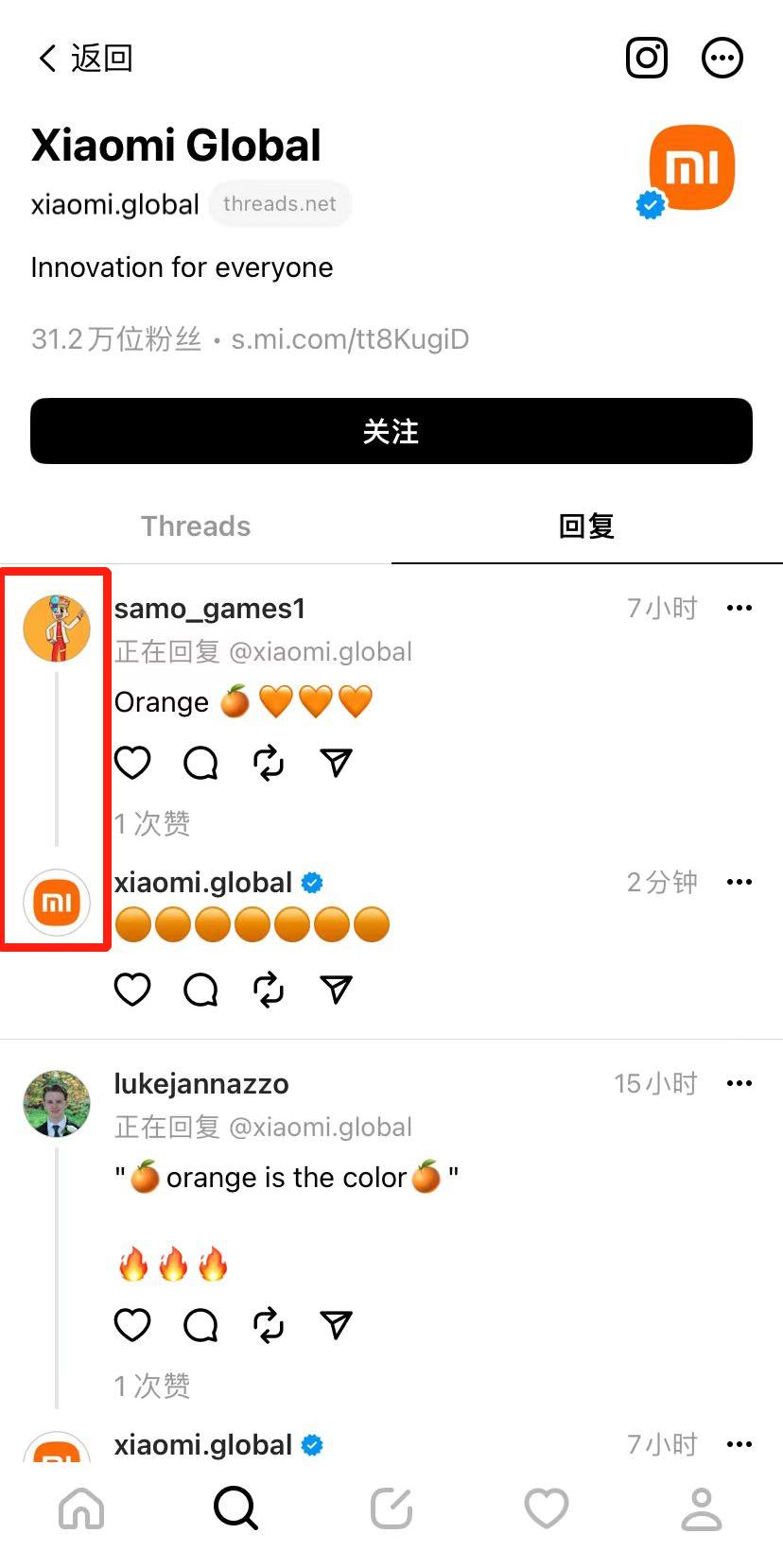 第二点是私信功能的缺失。 虽然用户在Threads平台上关注他人依然非常简单,但是如果要想和他人进行私信沟通就会相当麻烦了,因为Threads目前没有私信功能。在Threads上,用户联系他人的最有效、直接的方式就是对他人进行评论,那么放在国内场景下的话,就意味着连私聊加个微信的操作都会变成困难重重。