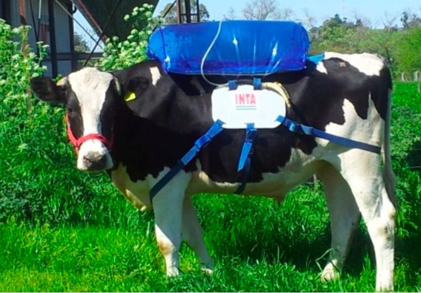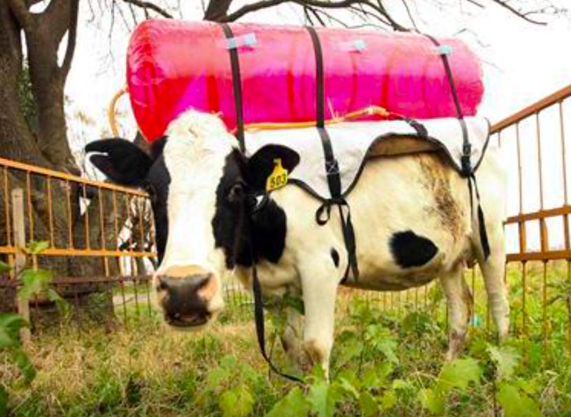 根据路透社2008年的一篇报道[3],阿根廷农业技术方面的科学家经过数年的准备,给至少10头牛装备了双肩包(四肩包?)——这是一个系在牛背上的红色塑料筒,通过一根管道跟牛最大的胃瘤胃连接在一起,通过这样的方式收集牛消化系统产生的气体。