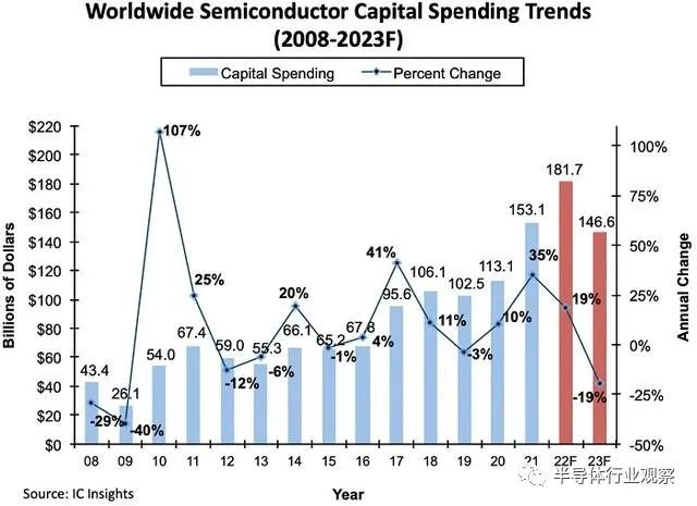 近日,据IC Insights数据显示,继2021 年半导体资本支出增长35%,2022年增长15%以后,预测2023年半导体资本支出将下降14%。